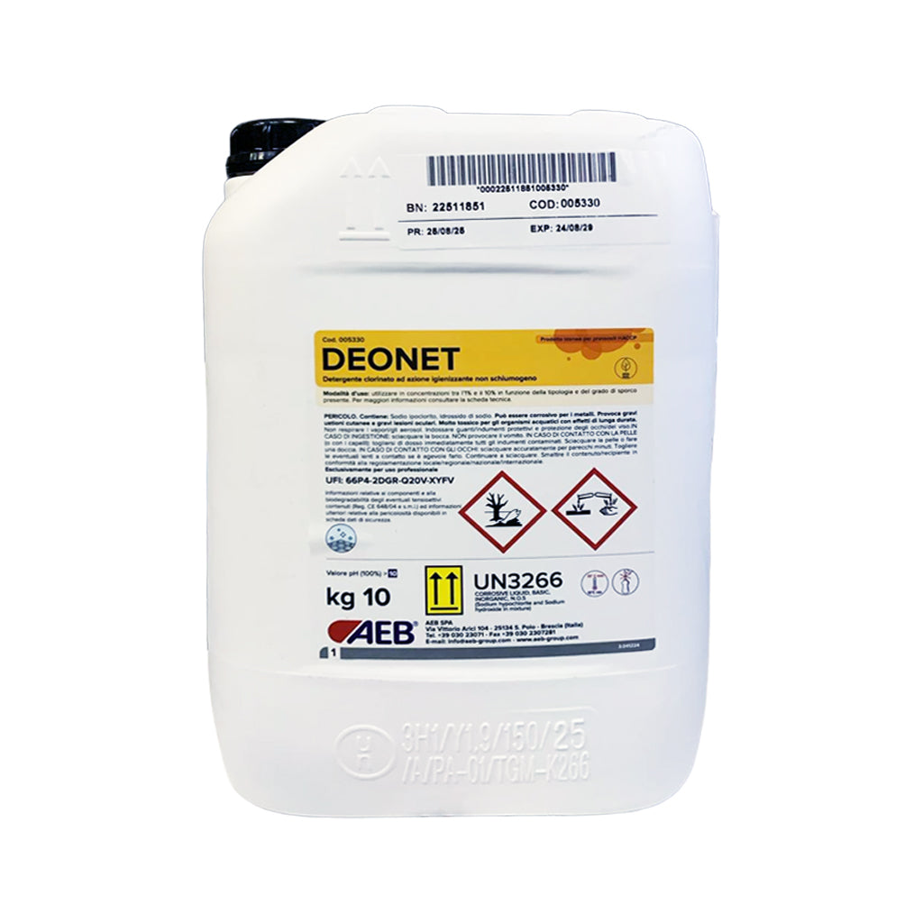 Deonet è un detergente liquido con cloro adatto per tutti i trattamenti di pulizia manuale laddove sia necessario ottenere una corretta azione lavante unita ad un effetto decontaminante e deodorante. Deonet è in grado di liberare un tenore in cloro elevato idoneo anche per situazioni di sporco e contaminazione microbica elevata. Deonet risulta ideale anche in tutti quei casi in cui è necessario ottenere un effetto decolorante a causa della presenza di sporco associato a colorazioni particolare (sporco vegetale, caffè, tè...).