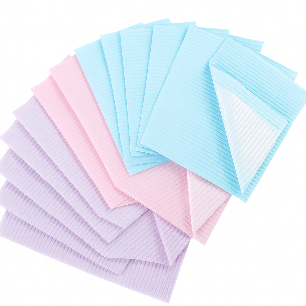 Bavagli per dentisti ad alta capacità assorbente e impermeabilità. Il prodotto è estremamente resistente agli strappi e non provoca fastidi o pruriti durante l’utilizzo. Il prodotto è composto da due strati di carta (17 gr/m2) incollato ad una pellicola di polietilene (13 gr/m2). Latex free.