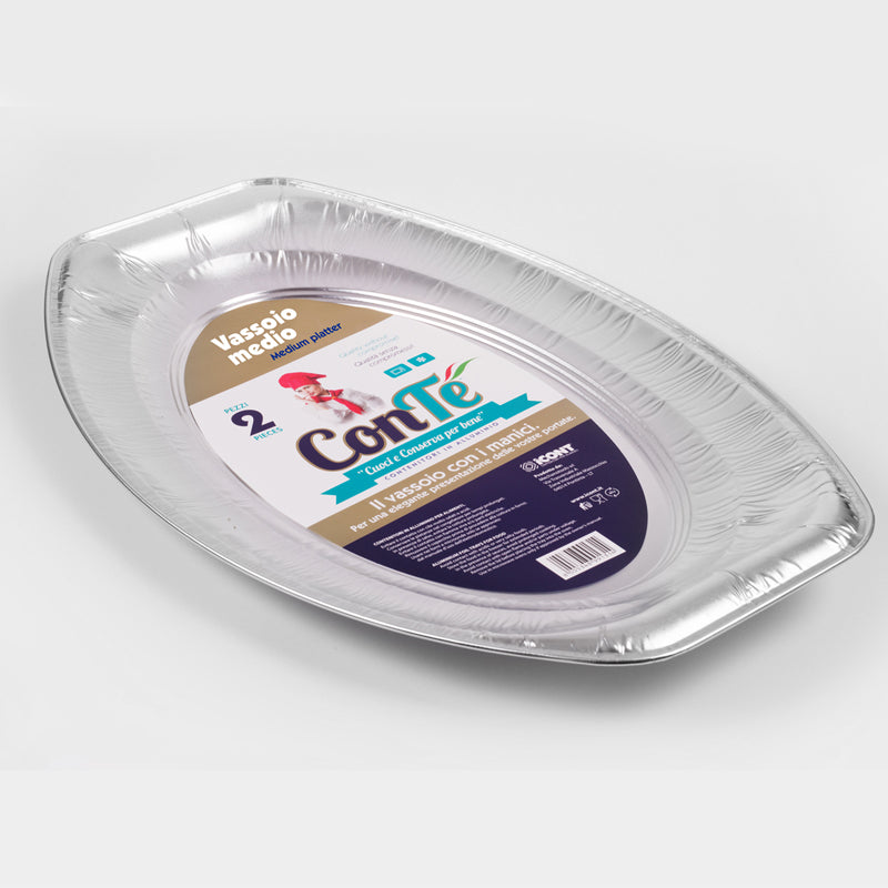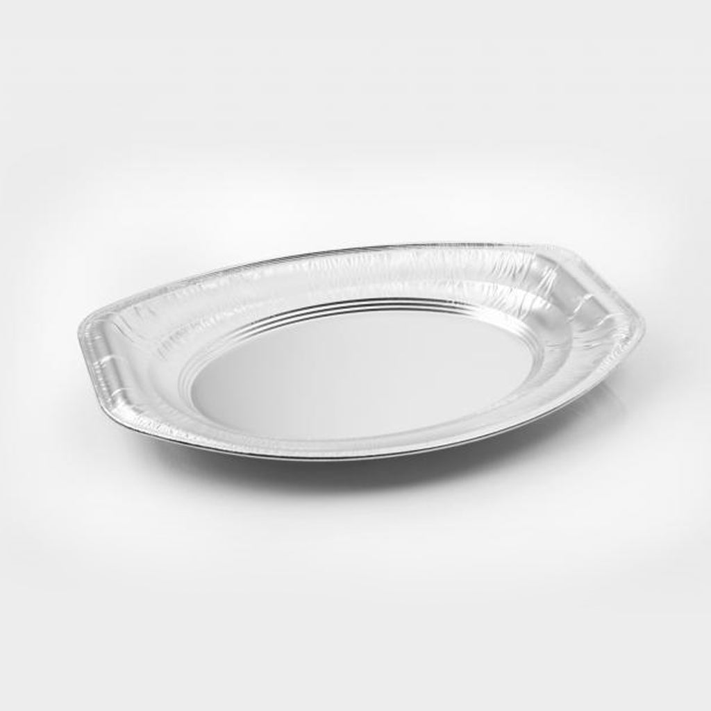 Vassoio ovale in alluminio lucido, leggero e resistente, ideale per il servizio e la presentazione di piatti dolci o salati.